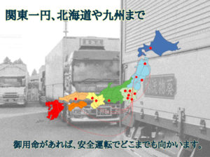 関東一円を中心に北は北海道、中部地方や関西地方、南は九州地方まで輸送業務を行っております。